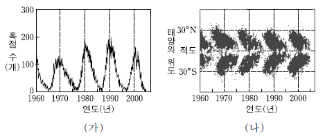 그림 (가)와 (나)는 시간에 따른 태양의 흑점 수와 위도별 흑점 분포를 각각 나타낸 것이다.