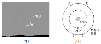 그림 (가)는 어느 날 우리나라에서 관측한 화성과 달의 모습을, (나)는 태양과 지구에 대한 화성의 상대적인 위치를 나타낸 것이다.