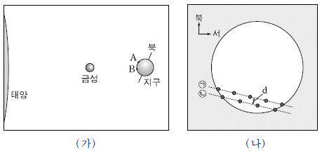 그림 (가)는 금성의 태양면 통과 현상이 나타나는 동안 태양과 금성, 관측소 A와 B의 상대적인 위치 관계를 나타낸 모식도이고, (나)는 두 관측소에서 본 금성의 이동 궤적 ㉠과 ㉡을 순서 없이 나타낸 것이다.