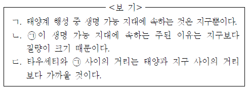 따라서, 생명 가능 지대와 외계 행성의 존재 가능성을 모두 고려할 때, 별의 질량이 작은 경우와 큰 경우 모두 고려해야 한다. 따라서 "ㄱ, ㄷ"가 옳은 대답이다.