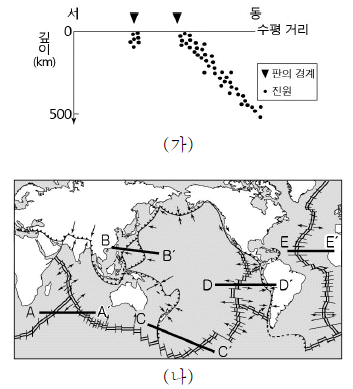 [과목 구분 없음] 그림 (가)는 어느 지역의 진원 분포를, (나)는 판의 경계와 이동 방향을 나타낸 것이다.