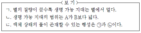- ㄴ: B 중심별의 생명 가능 지대에는 B1, B2, B3 행성이 위치하고 있지만, B1과 B2는 너무 가까워서 서로의 중력에 영향을 주기 때문에 생명체가 살 수 있는 조건을 갖추기 어렵다. 따라서 B3 행성만이 생명체가 살 수 있는 조건을 갖추고 있으므로 옳지 않다.