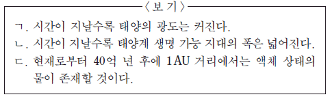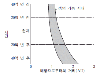 그림은 태양계 생명 가능 지대의 변화를 시간에 따라 나타낸 것이다.