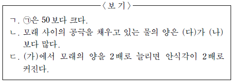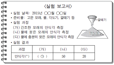 다음은 물이 안식각에 미치는 영향을 알아보기 위해 실험을 수행하고 작성한 보고서의 일부이다.