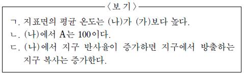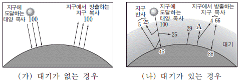 그림 (가)와 (나)는 복사 평형 상태에서의 지구 열수지를 대기의 유무에 따라 나타낸 것이다.