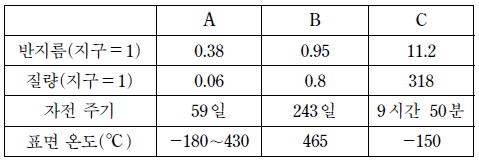 표는 태양계 행성 A, B, C의 물리량을 나타낸 것이다.