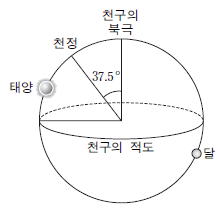 그림은 어느 날 북반구 중위도 지역에서 관측한 태양과 달의 위치를 천구에 나타낸 것이다.