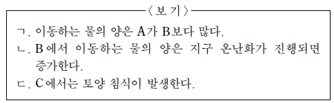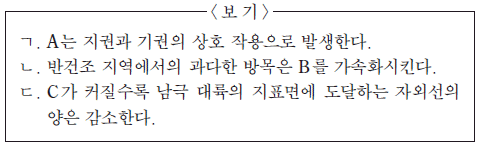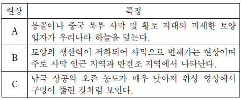 다음은 지구 환경 변화로 인해 나타나는 현상 A, B, C 의 특징이다.