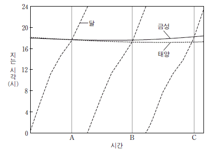 그림은 우리나라에서 어느 해 약 3 개월 동안 태양, 달, 금성이 지는 시각을 나타낸 것이다.