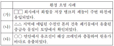 표는 우리나라에서 발생한 환경 오염 사례를 나타낸 것이다.