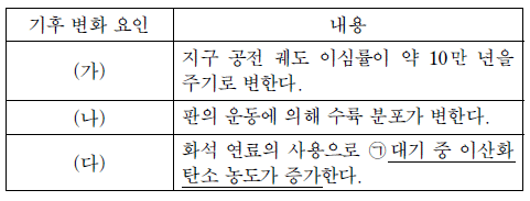 [과목 구분 없음] 표는 지구의 기후 변화를 일으키는 요인에 대한 설명이다.