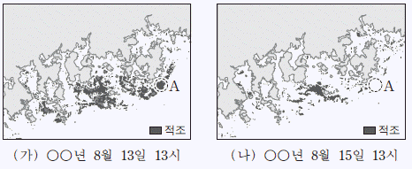 [과목 구분 없음] 그림 (가)와 (나)는 적조의 분포를 48 시간 간격으로 나타낸 것이다.