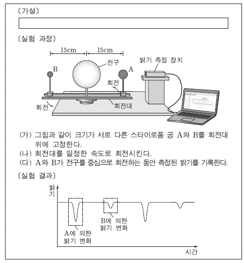 [과목 구분 없음] 다음은 영희가 외계 행성 탐사 방법을 이해하기 위해 가설을 세우고 수행한 실험이다.