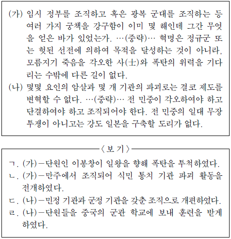 [과목 구분 없음] 다음 자료는 어느 단체의 운동 방략의 변화를 나타낸 것이다. 이 단체가 (가), (나) 방략에 따라 전개한 활동으로 옳은 것을 <보기>에서 고른 것은? [3점]