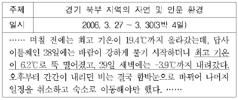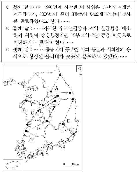 다음 글은 학생이 작성한 여행기의 일부이다. 여행 경로를 바르게 나타낸 것은?[3점]