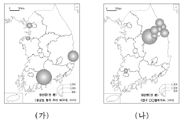 (가), (나)는 어느 공업의 분포를 나타낸 것이다. 각 공업의 특징을 설명한 것으로 옳은 것은?