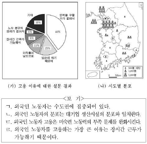 (가), (나)는 우리나라 제조업의 미숙련 외국인 노동자 고용에 관한 자료이다. 이에 대한 설명으로 옳은 것을 <보기>에서 모두 고른 것은? [3점]