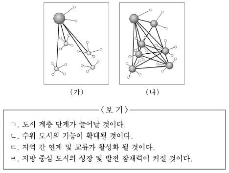 미래의 국토 정주 체계를 (가)에서 (나)로 개편하려고 한다. 이에 따라 예상되는 변화를 <보기>에서 모두 고른 것은? [3점]