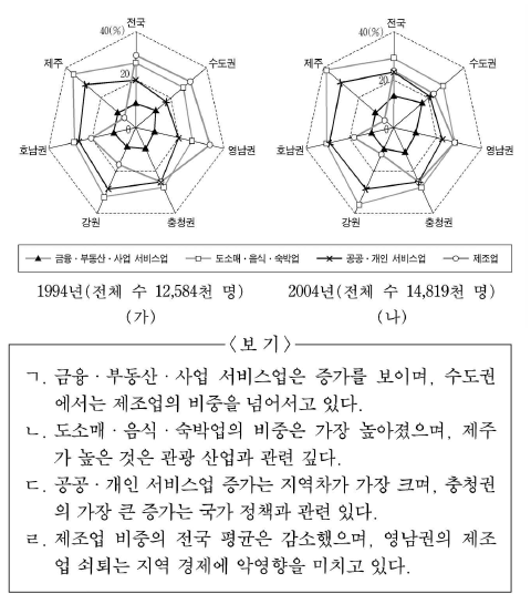 (가), (나)는 사업체 종사자 수의 산업별 분포를 나타낸 자료이다. 이에 대한 설명으로 옳은 것을 <보기>에서 모두 고른 것은? [3점]