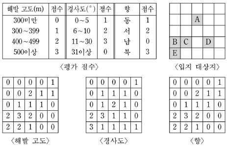 강원도는 동계 올림픽 유치를 위해 GIS를 활용한 스키장 건설 입지 분석을 행하였다. 아래 조건에 따른 최적 입지는?