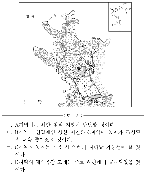 [과목 구분 없음] 지형도를 보고 추론한 내용으로 적절한 것을 <보기>에서 고른 것은?