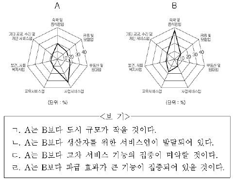 A, B 두 도시 특성을 알맞게 비교한 것을 <보기>에서 모두 고른 것은?[3점]