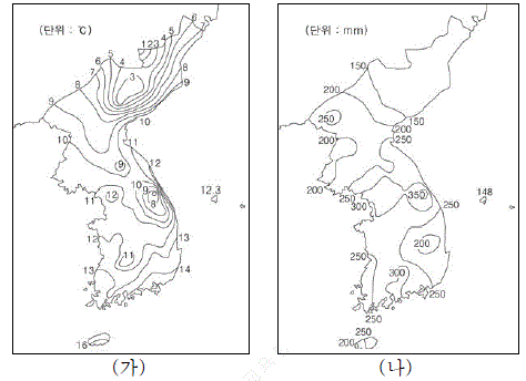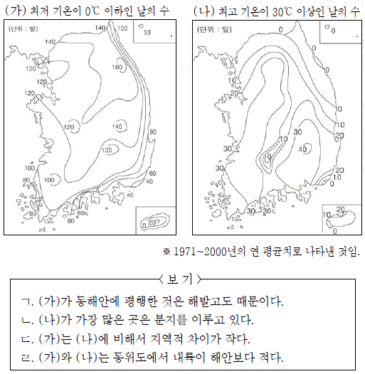 지도는 어떤 기후 현상의 평년값 분포를 나타낸 것이다. (가),(나)에 해당하는 기후 요소를 바르게 짝지은 것은? (순서대로 가, 나) [3점]