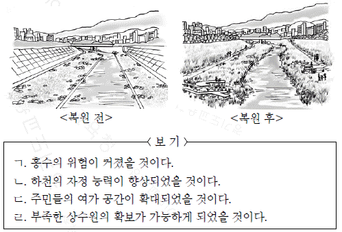 그림은 대도시 어떤 지역의 하천 복원 전과 후의 모습이다. 이 지역에 나타난 변화를 옳게 추론한 것을 <보기>에서 고른 것은?