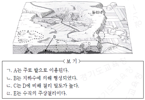 다음은 어떤 지형의 모식도이다. A~E에 관한 옳은 설명을 <보기>에서 고른 것은?