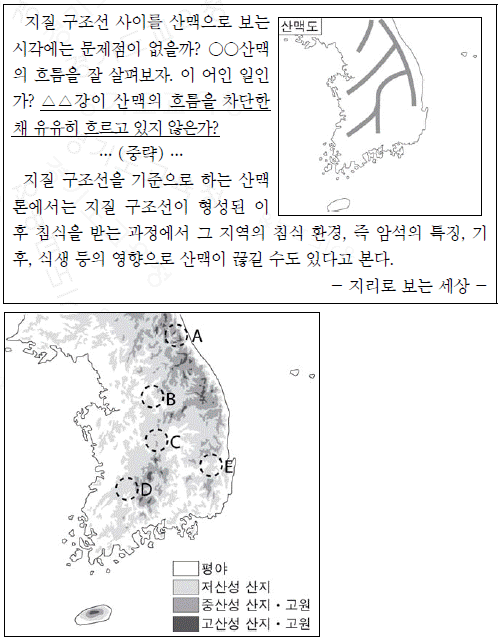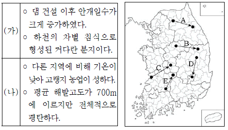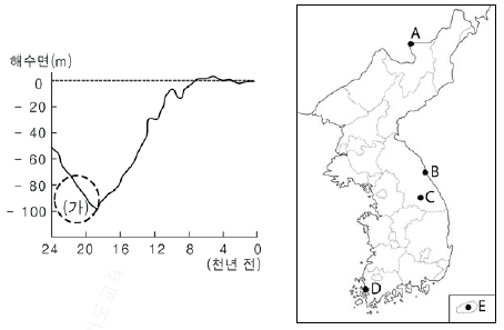 그래프의 (가)시기에 지도의 A~E 지점에서 나타난 현상을 옳게 추론한 것은? [3점]