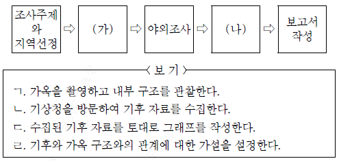 ‘울릉도 전통 가옥 구조의 특징’을 조사하고자 한다. (가)와 (나) 단계에 해당하는 활동을 <보기>에서 골라 바르게 짝지은 것은? (순서대로 가, 나)