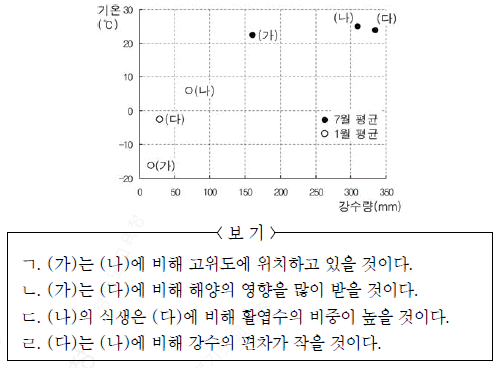 그래프는 (가) ~ (다) 지역의 1월과 7월의 평균 기온과 강수량을 나타낸 것이다. 이에 대한 옳은 추론을 <보기>에서 고른 것은? [3점]