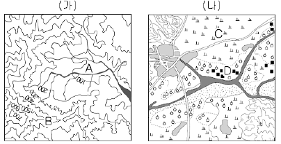 (가) (나)와 같은 특색이 나타나는 지역을 지도에서 알맞게 고른 것은? (순서대로 가, 나) [3점]