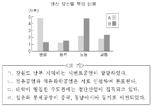 그래프의 A, B에 해당하는 공업 입지 사례로 알맞은 것은?(단, 주어진 생산 요소만 고려할 때) (순서대로 A, B)