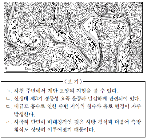 지도의 하천과 관련된 내용으로 옳은 것만을 <보기>에서 있는 대로 고른 것은?