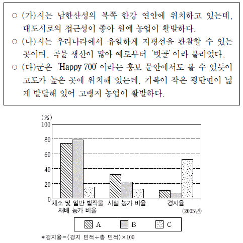 다음 글의 (가)~(다)에 해당하는 지역을 그래프의 A~C에서 고른 것은? (순서대로 가, 나, 다) [3점]