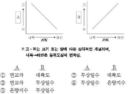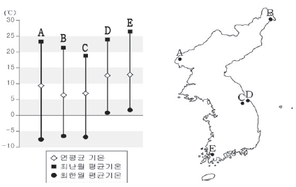 다음은 각 지역의 기온 특성을 나타낸 것이다. A~E지역의 기온이 래프와 같이 나타나는 이유로 옳지 않은 것은? [3점]