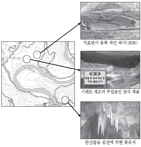 다음은 수업시간에 교사가 제시한 지도와 사진이다. 사진 경관이 나타나는 지형과 관련된 탐구 주제로 가장 적절한 것은?
