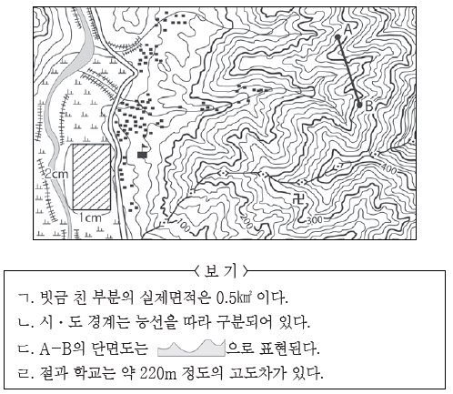 지형도를 읽은 내용으로 옳은 것을 <보기>에서 고른 것은? [3점]