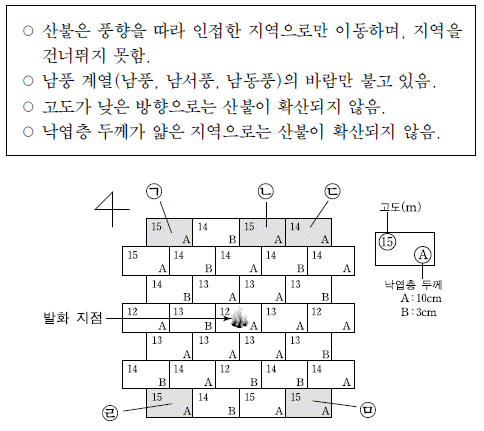 GIS를 이용하여 산불 피해 지역의 확산을 예측해 보았다. 발화 지점으로부터 산불이 가장 멀리 도달할 수 있는 지역은? (단, 주어진 조건만 고려함)