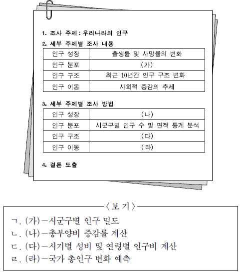 다음은‘우리나라의 인구’에 대한 조사 계획서이다. (가)~(라)에 들어갈 내용으로 옳은 것을 <보기>에서 고른 것은?[3점]