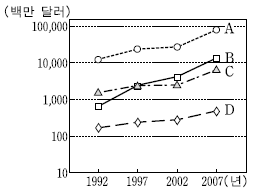 그래프의 A~D에 해당하는 지역으로 옳은 것은? (순서대로 A, B, C, D) [3점]