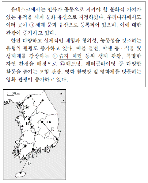 다음 글을 읽고 (ㄱ), (ㄴ), (ㄷ)을 순서대로 체험할 수 있는 경로를 지도에서 고른 것은?[3점]
