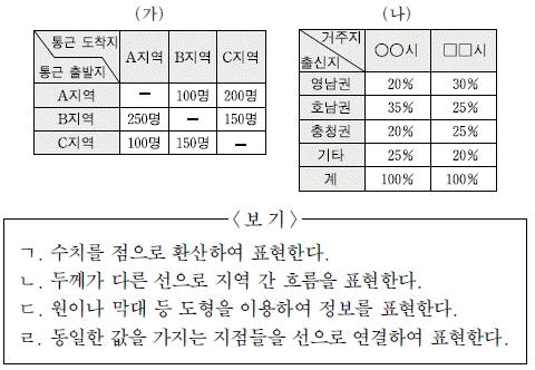 (가), (나) 자료를 지도로 표현하기에 가장 적절한 방법을 <보기>에서 고른 것은? (순서대로 가. 나)
