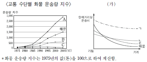 그래프의 A~C에 해당하는 교통 수단을 (가)에서 고른 것은? (단, 국내 운송만 고려함) (순서대로 A, B, C )