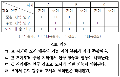 표는 도시 발달에 따른 어느 대도시의 지역별 인구 변화를 나타낸 것이다. A~C시기에 대한 설명으로 알맞은 것을 <보기>에서 고른 것은?[3점]