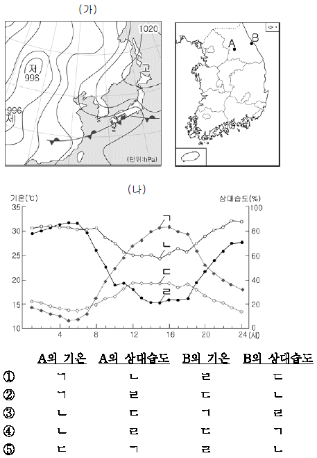 (가)와 같은 일기도가 나타날 때 A, B 지점 기후 요소의 시간대별 변화를 (나)에서 골라 알맞게 연결한 것은?[3점]