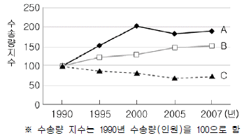 그래프는 도로, 지하철, 철도 교통의 국내 여객 수송량 지수이다. A~C에 대한 설명으로 알맞은 것은?