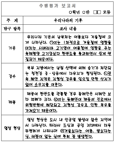 자료는 학생들이 우리나라 기후에 관해 작성한 보고서의 일부이다. (ㄱ)~(ㄹ)중 알맞은 내용을 고른 것은?[3점]