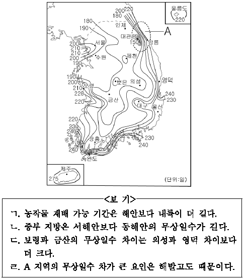 지도는 무상일수를 나타낸 것이다. 이를 분석한 내용으로 알맞은 것을 <보기>에서 고른 것은?